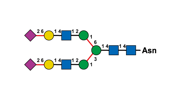 | Alternative names | A2G2S2, G2S2 α(2, 6), A2G(4)2S(6)2, disialo glycan, (NeuNAc-Gal-GlcNAc)2Man3(GlcNAc)2, NeuAc(a2-6)Gal(b1-4)GlcNAc(b1-2)Man(a1-3)[NeuAc(a2-6)Gal(b1-4)GlcNAc(b1-2)Man(a1-6)]Man(b1-4)GlcNAc(b1-4)GlcNAc |